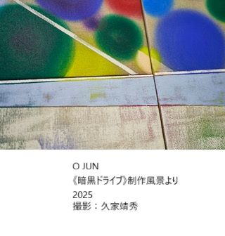 《暗⿊ドライブ》と名付けられた本作は、⾞が好きだった画家の友⼈との思い出に由来します。この数年の間、O JUN は同じモチーフ、タイトルで三度制作をしてきました。今回は縮尺ではなく原⼨⼤で描くことで、絵画の既存の枠組みを超えながらも、なお絵として成⽴するかどうかを試み、これまでにない絵画作品に挑みました。⾞の周りを彩るカラフルな円もまた、近年O JUNが取り組んできたアプローチであり、現在のO JUNを象徴する作品と⾔えるでしょう。