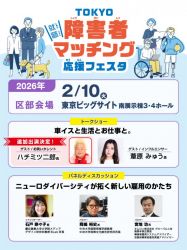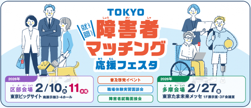 ■対象:障害を持つ方、支援者、障害者雇用を目指す企業等 - 【場所】【区部会場】 東京ビッグサイト 日時: 令和 8 年 2 月 10日( 火 午前 10 時 00 分から午後5 時まで) 令和 8 年 2 月 11日( 水・祝 午前 10 時 00 分から午後5 時まで) 【多摩会場】 たま未来メッセ 日時:令和 8年 2 月 27 日( 金 午前 10 時 から午後 5 時まで)