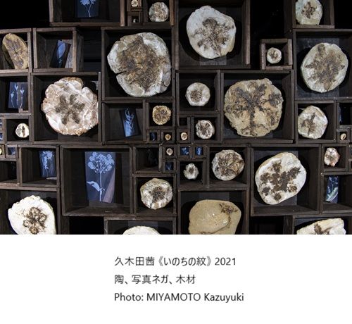 久木田茜は植物を解体・再構成した様式としての装飾に惹かれ、陶器やアクリル、金属などによって造形作品を制作しています。地域における自然観や信仰を反映し、建築や工芸をとおして生活に「付いて」(根付いて)いる装飾のかたちを作品化し、人と自然の結びつきについて探っています。
